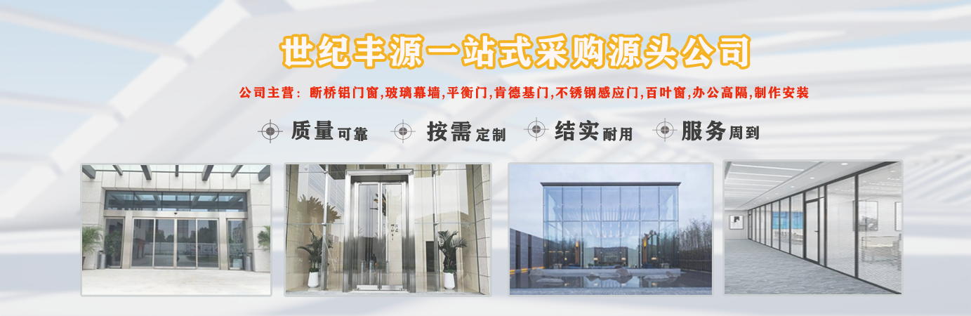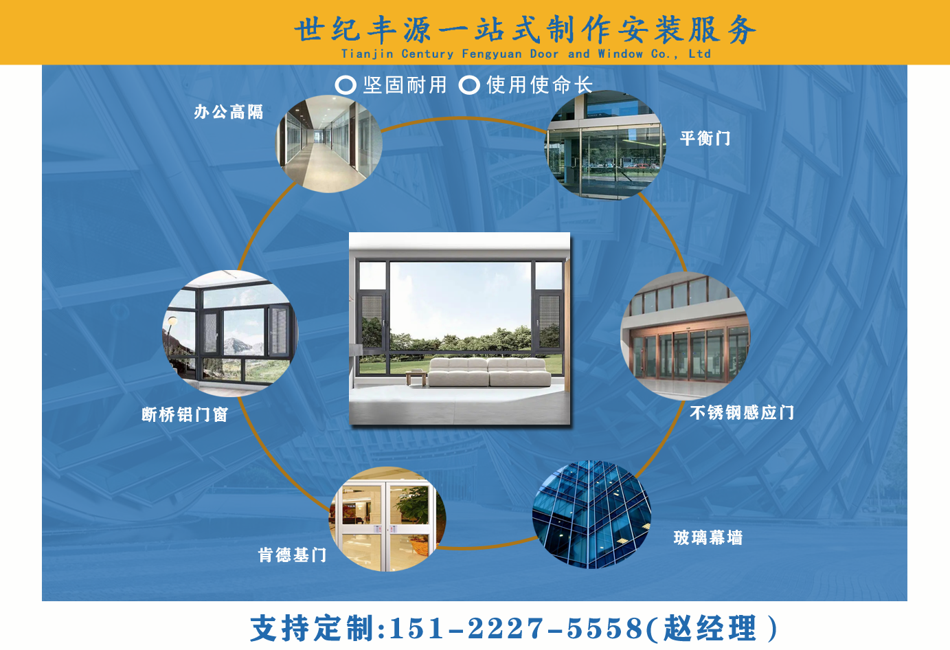 天津世紀豐源門窗有限公司從事斷橋鋁門窗,玻璃幕墻,平衡門,肯德基門,不銹鋼感應門,百葉窗,辦公高隔,制作安裝一站式訂制生產(chǎn)及配套服務等。 公司自成立以來,始終堅持以人才為本、誠信立業(yè)的經(jīng)營原則,薈萃業(yè)界精英,成熟的技術、管理方法及企業(yè)經(jīng)驗與國內(nèi)企業(yè)的具體實際相結(jié)合,為企業(yè)供給各個方面的解決方案,使企業(yè)在激烈的市場競爭中始終堅持競爭力,實現(xiàn)企業(yè)快速、穩(wěn)定地發(fā)展?! ≠|(zhì)量好、服務好、才能信譽好,公司已在諸多領域取得輝煌成績,愿意成為您可信賴的長期合作伙伴?! ∽屛覀償y手同行,共同實現(xiàn)“讓普通老百姓都用得上高端門窗”...